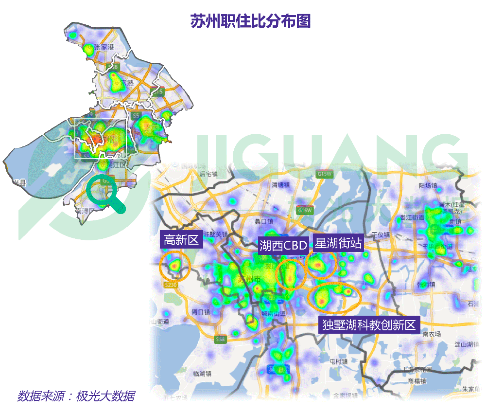 位于苏州工业园区的湖西CBD、工业园区地铁星湖街站周边和被誉为“苏州硅谷”的独墅湖科教创新区是苏州职住比较高的区域。