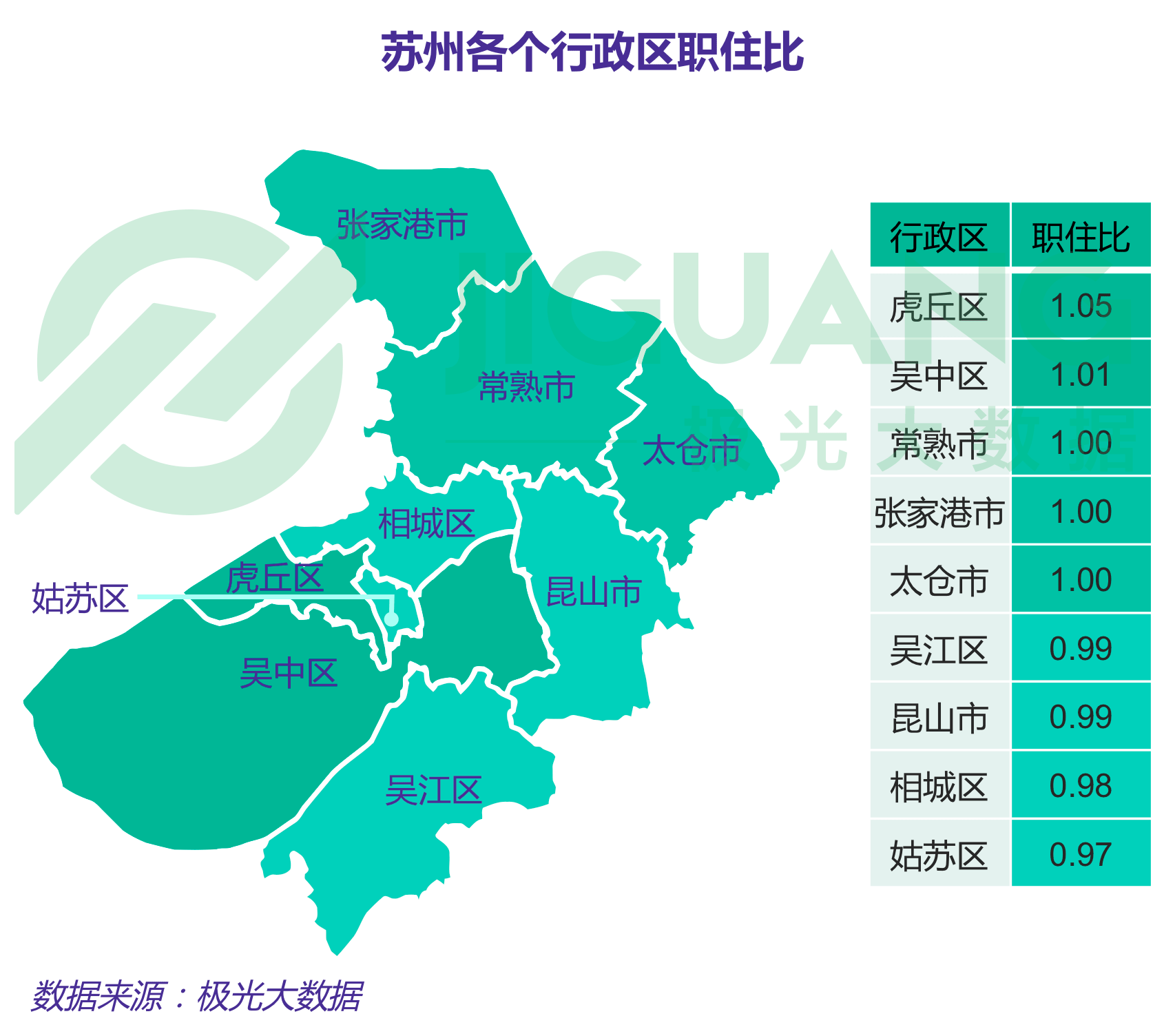 苏州市各个行政区的职住比较为均衡,均在0.97到1.05之间,虎丘区职住比最高,达1.05,姑苏区职住比最低为0.97。