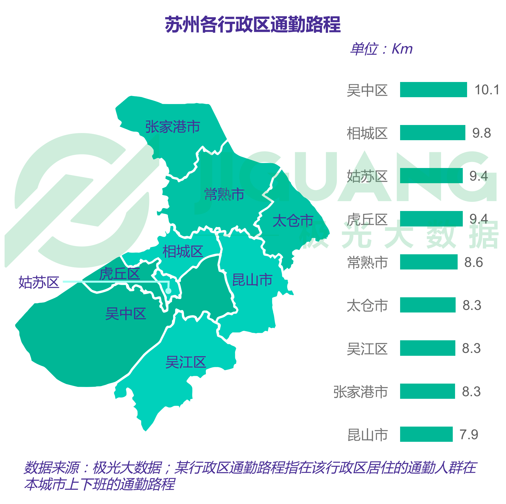 苏州市各区通勤路程中,吴中区通勤路程达10.1公里,相城区通勤路程达9.8公里,姑苏区通勤路程达9.4公里,是苏州市通勤路程最长的三个区。