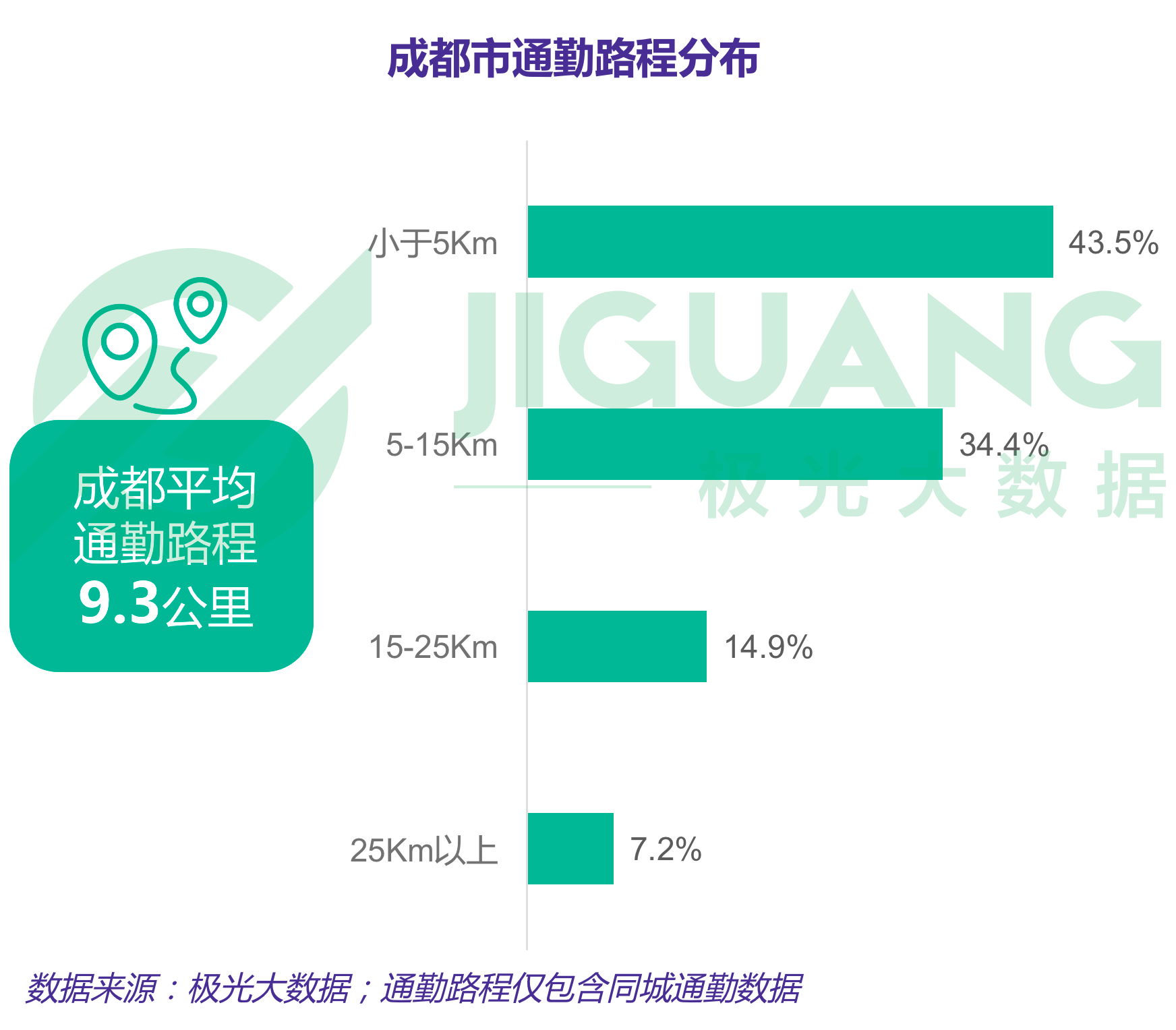 成都市平均通勤路程达9.3公里,其中,小于5公里通勤路程的人群占比达43.5%,5到15公里之间通勤路程的人群占比34.4%,15-25公里之间通勤路程的人群占比14.9%,超过25公里通勤路程的人群占比7.2%。