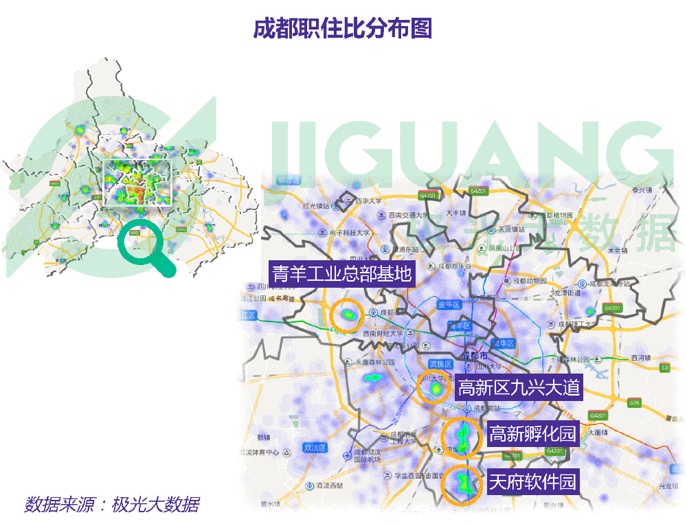 成都市青羊工业总部基地、高新区九兴大道、高新孵化园和天府软件园是成都职住比较高的区域。