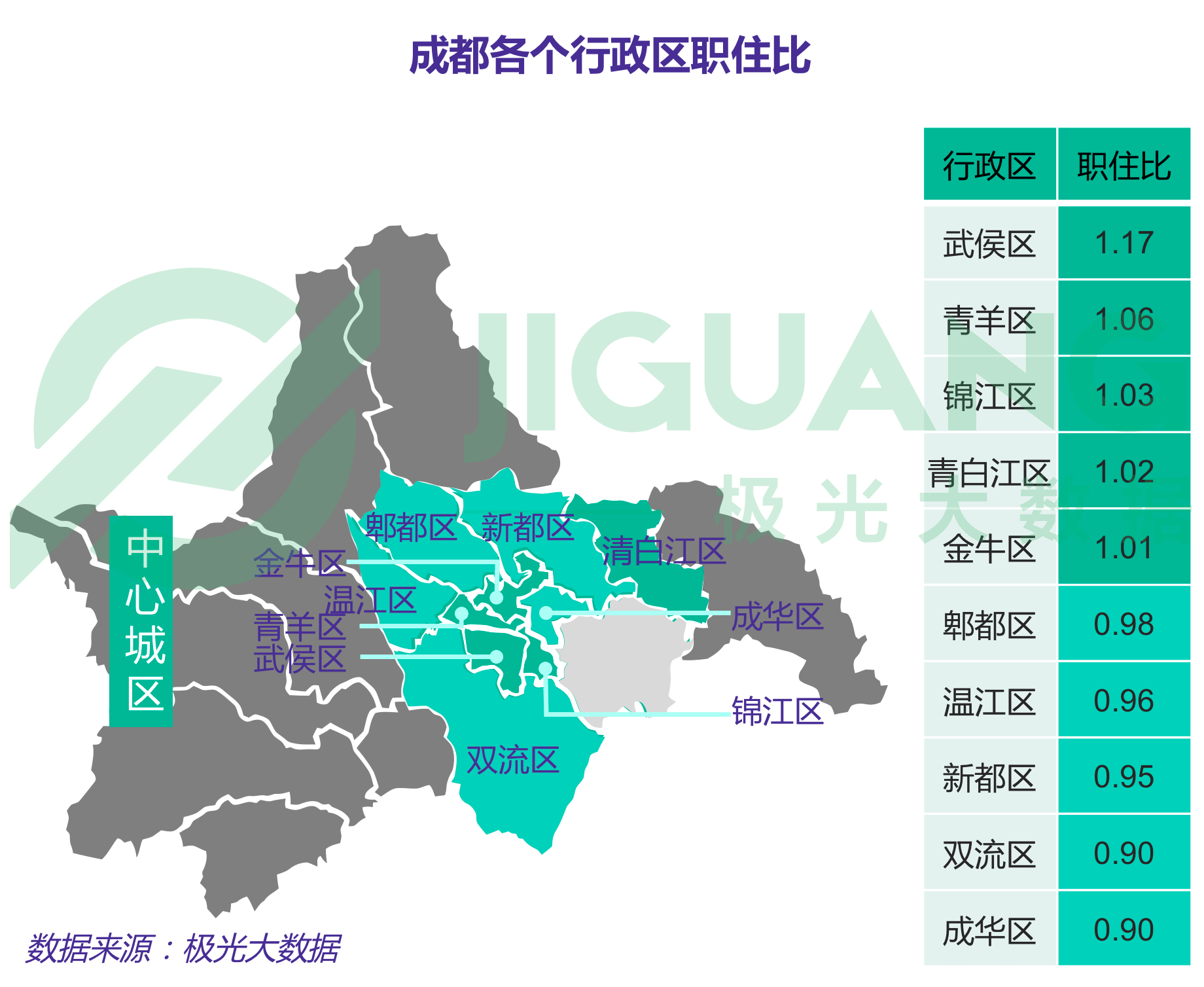 成都中心城区各个行政区武侯区的职住比达1.17,青羊区的职住比达1.06,锦江区的职住比达1.03,三个区域职住比最高。
