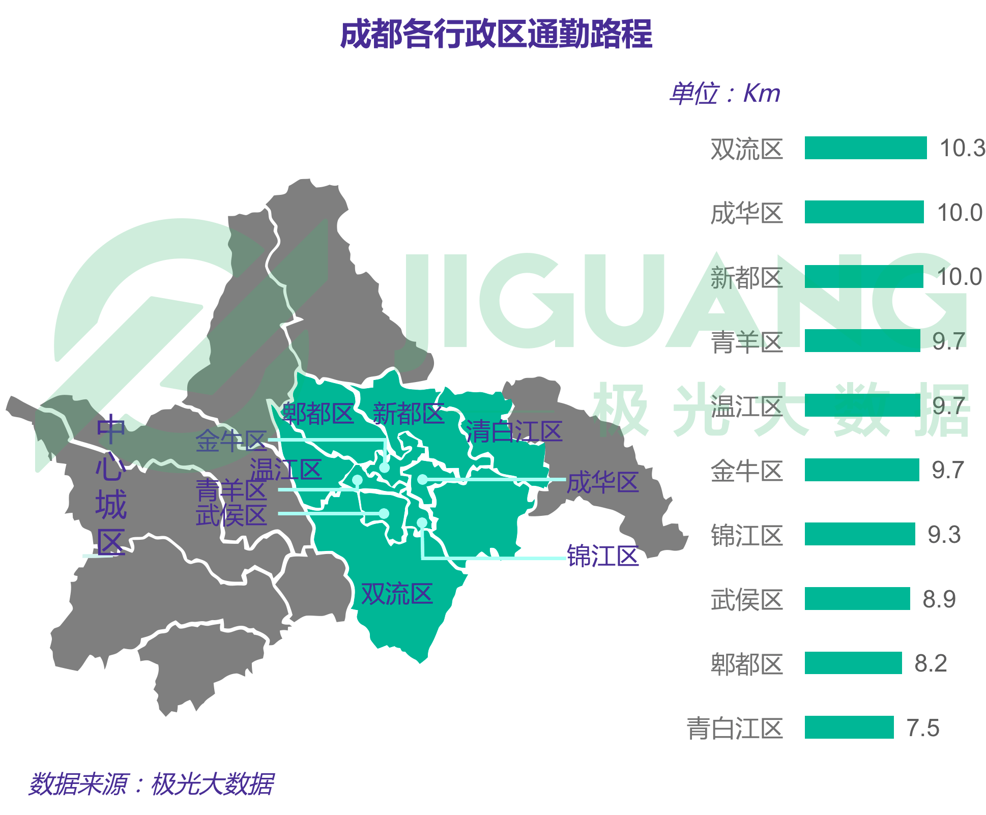 成都中心城区中,双流区通勤路程达10.3公里,成华区和新都区的通勤路程均为10公里,而青白江区仅为7.5公里。