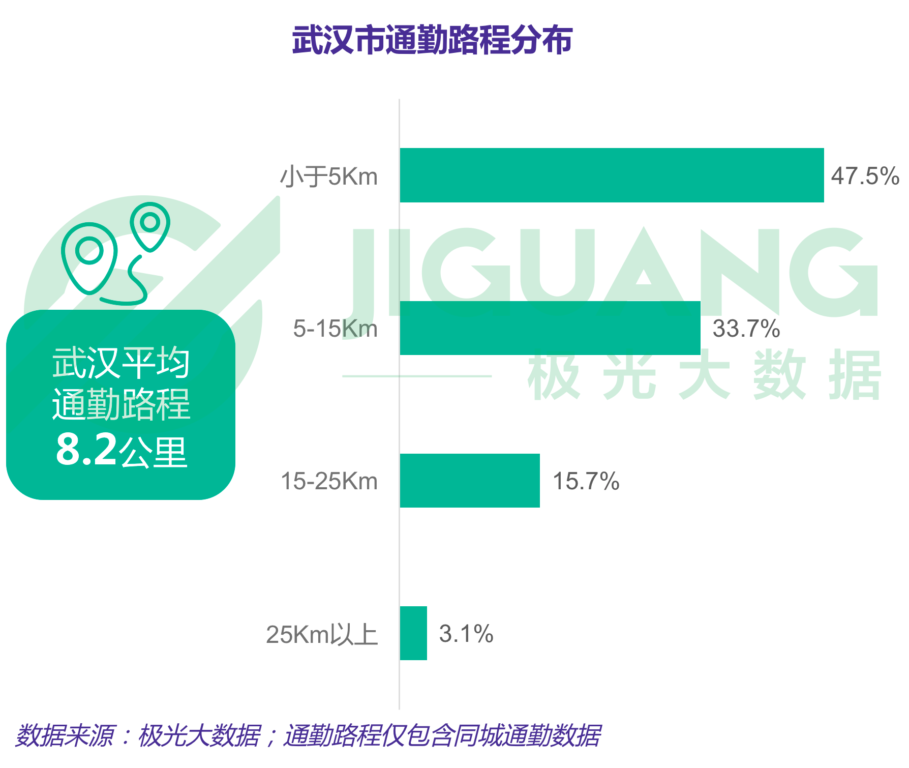 武汉市平均通勤路程是8.2公里,其中,小于5公里通勤路程的群体占比47.5%,5到15公里之间通勤路程的群体占比33.7%,15到25公里之间通勤路程的群体占比15.7%,超过25公里通勤路程的群体达3.1%。