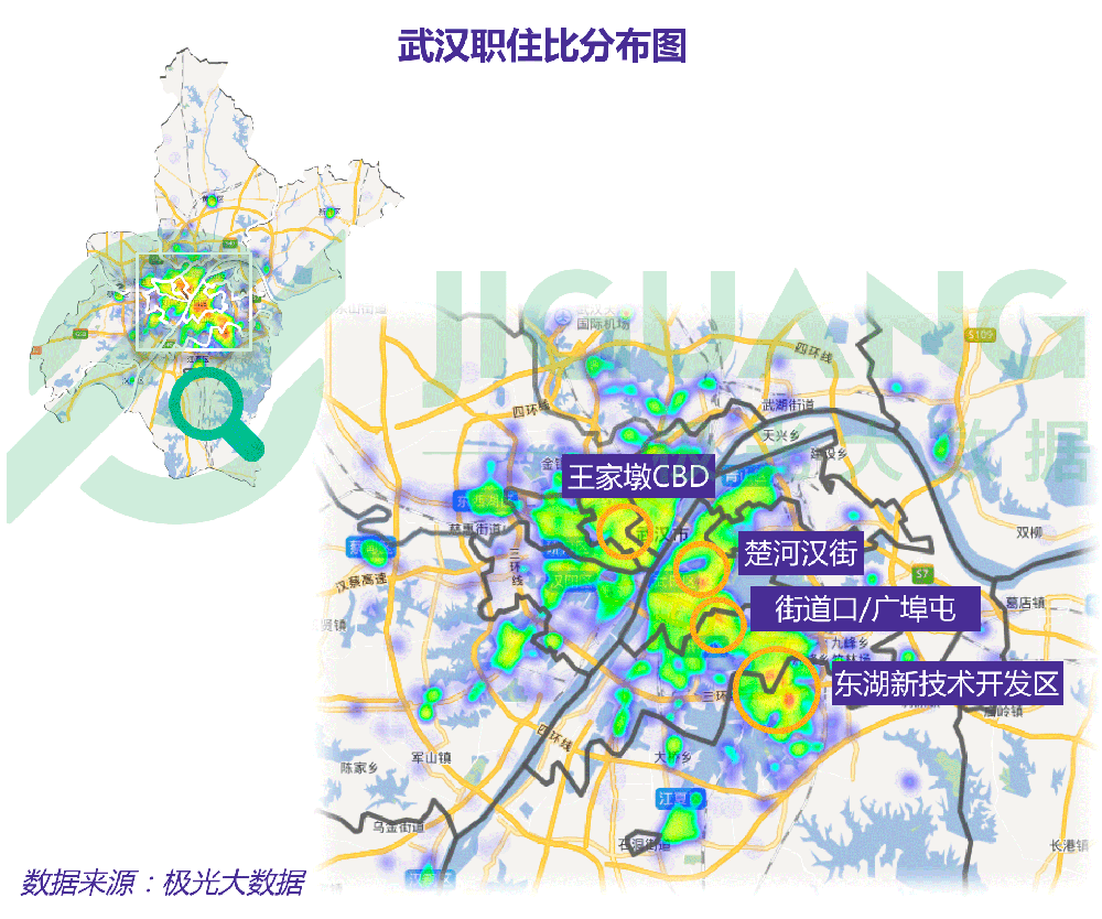 武汉的主要行政区域中,位于江汉区的王家墩CBD、武昌区的楚河汉街、洪山区的街道口/广埠屯和东湖新技术开发区是武汉高职住比区域。