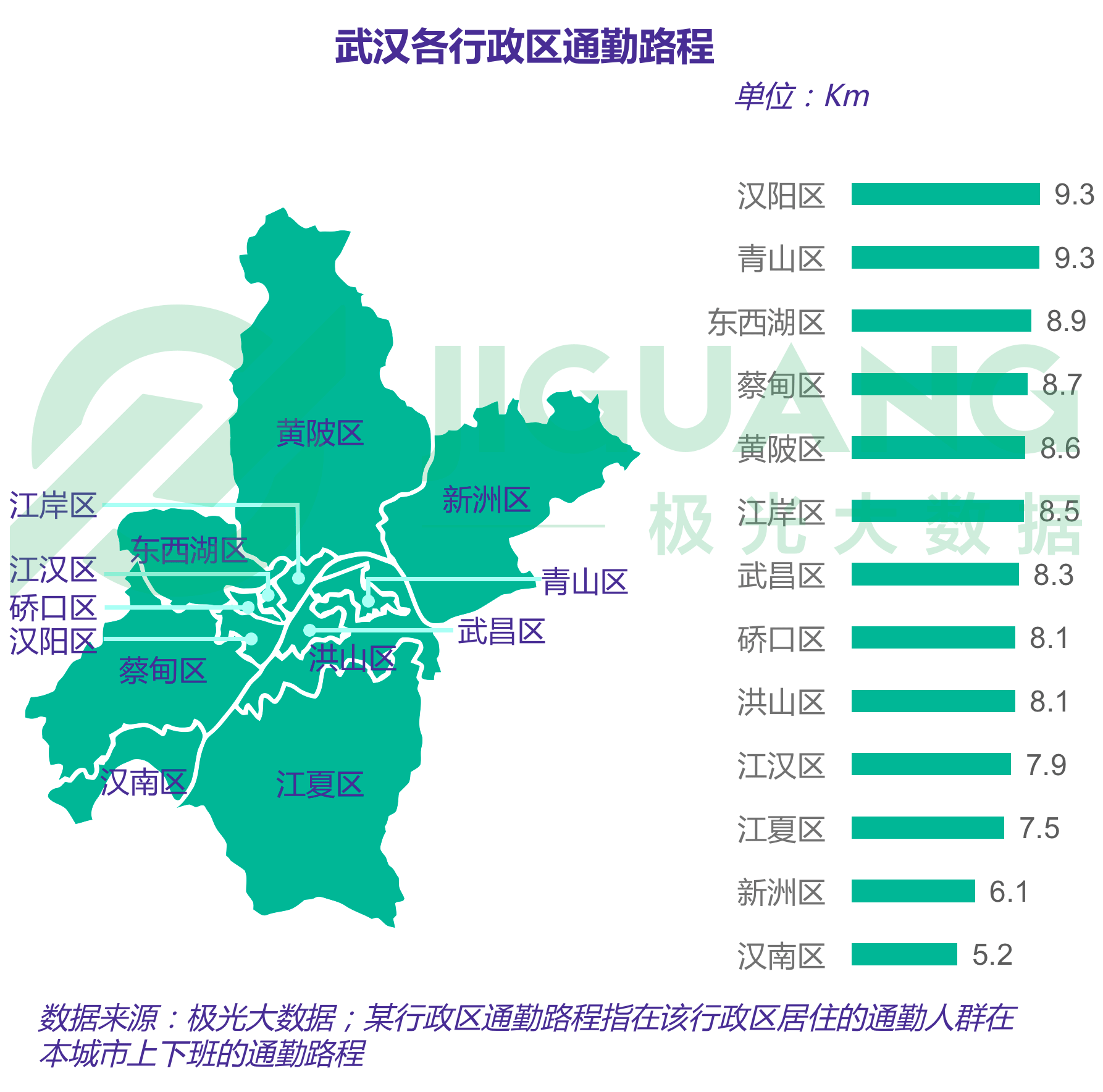 武汉市各个区通勤路程均低于10公里,汉阳区和青山区最长,达9.3公里;汉南区通勤路程最短,仅为5.2公里。