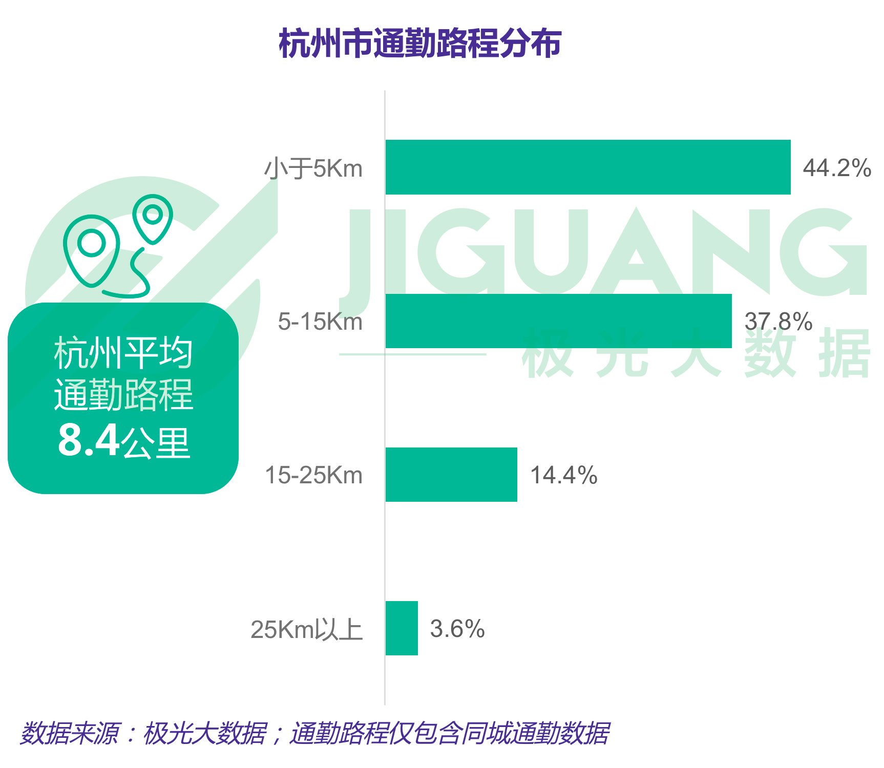 杭州市平均通勤路程为8.4公里,其中,小于5公里通勤路程的群体占比44.2%,5到15公里之间通勤路程的群体占比37.8%,15到25公里之间通勤路程的人群占比14.4%,超过25公里通勤路程的人群占比3.6%。