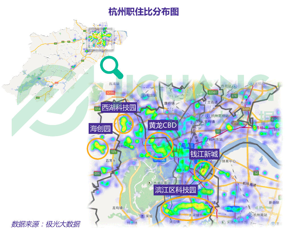 杭州的主要行政区域中,位于江干区的钱江新城、位于西湖区北部城区的黄龙CBD、西湖科技园、海创园和滨江区科技园是杭州职住比较高的区域。