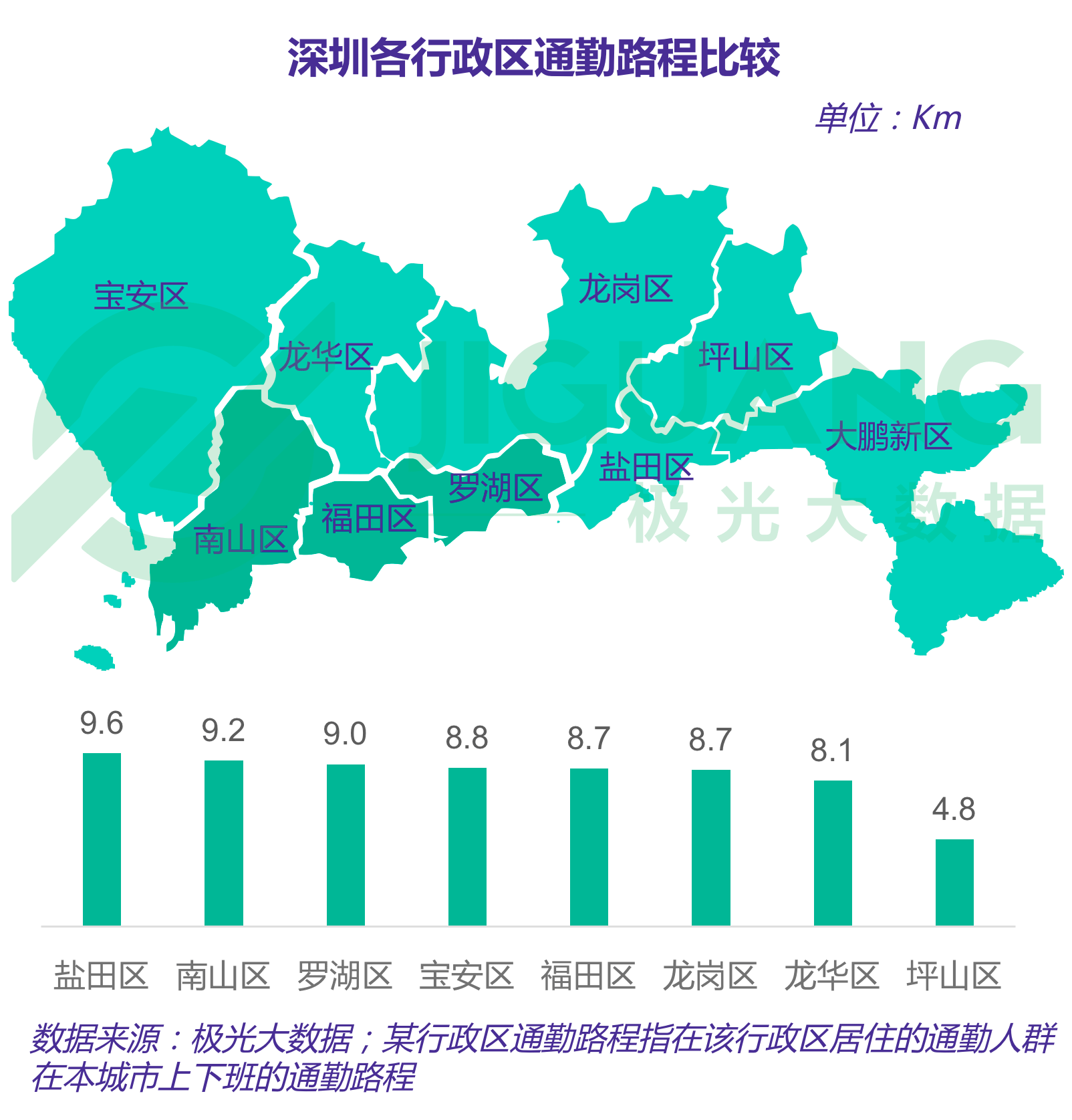 在深圳市各区中,除了通勤路程最短的坪山区以外,其他各区的通勤路程均在8.1至9.6公里之间,盐田、南山和罗湖的通勤路程最高,均超过9公里。