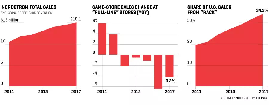然而,远处的阴云仍不能忽视。诺德斯特龙的零售业务主要依赖商场,不断缩水的商场客流量已经产生了负面影响,该公司全品类商店的销售额已连跌五年,越来越依靠打折连锁店Nordstrom Rack的销售增长。但有专家担心这棵卖减价产品的摇钱树会影响公司主品牌的声誉。而公司花大价钱投资科技、开新店铺,这些投资哪怕最后能证明物有所值,也已经侵蚀了利润,吓坏了华尔街:公司股价和2015年年初的最高点比,已经下跌了40%。