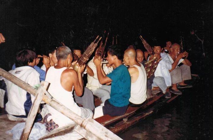 村中有条主街,住宅顺两旁延伸。乐社穿街而过,行至一座桥边,改陆道为水道。天已擦黑。目击乐社到来,艄公将第一盏荷灯放入水中。“文场”(旋律乐器)坐一条船,“武场”(打击乐器)坐一条船,鱼贯离岸。