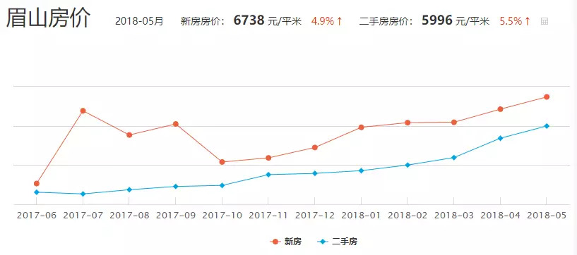 价格整体走势上,应该是受供应产品形态的影响,去年7月出现过一个价格高点,超过了6000元/平米,后逐渐回落。然后,在今年1月开始发力,呈现持续走高之势,截止目前均价已经接近7000元/平米了,而去年6月,眉山的均价还处在4500元/平米左右,涨幅已经超过了2000元/平米。