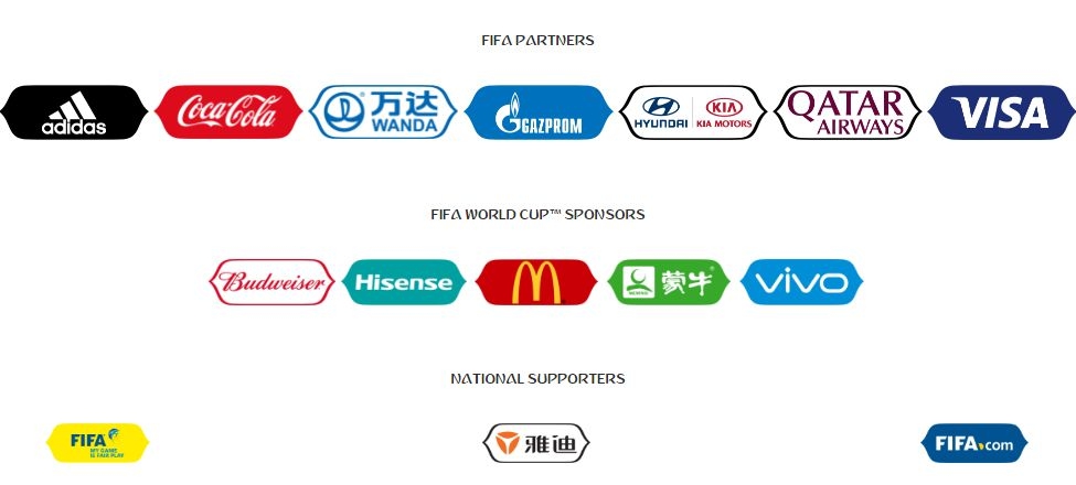 此外,电器品牌海信、乳品公司蒙牛、手机品牌vivo成为国际足联的第二级赞助商(官方赞助商),占据该级别五家赞助商中的三家。至于去年开设的第三级赞助商(区域赞助商),国际足联也吸纳了雅迪电动车、帝牌男装和指点艺境VR等三家中国企业。