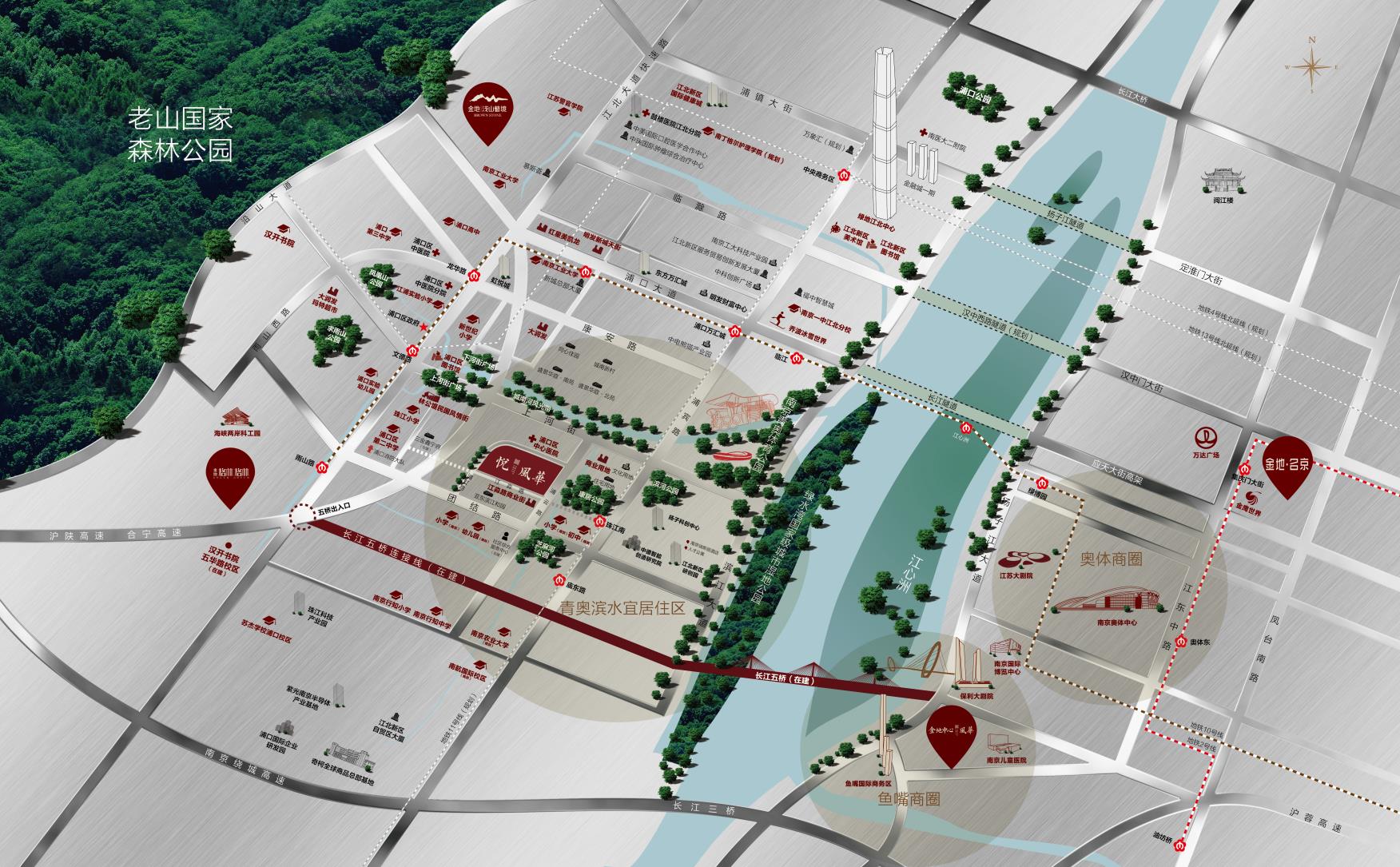 现代人讲求的不仅是繁华便捷的都市生活,更注重健康养生,喜欢将生活与大自然结合在一起,而悦风华能同时满足这两个条件。项目周边拥有国家5A级老山森林公园、青奥体育公园这样得天独厚的环境资源,空气清新,景色宜人,是生态宜居之地。未来还将新建江北新区城市馆、南京美术馆新馆、江北新区图书馆等一系列娱乐休闲配套丰富片区需求。