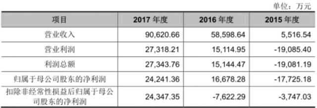 招股书显示,2015年、2016年、2017年,营业收入分别为0.55亿元、5.86亿元、9.06亿元,净利润分别为-1.77亿元、1.67亿元、2.42亿元。主营业务毛利率分别为 86.44%、97.45%和98.33%,毛利率较高且保持稳定增长。