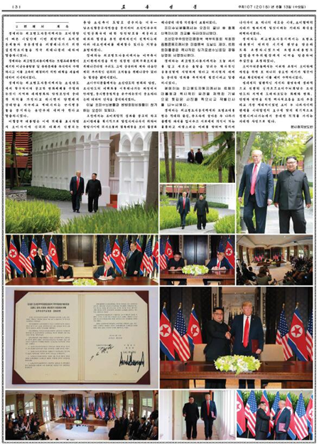 13日,朝鲜劳动党机关报《劳动新闻》通过四个版面详细报道了朝美首脑会谈的相关内容。其中,第一版至第三版是题为《开辟朝美关系新历史的世纪会晤——金正恩同特朗普举行历史上的首次朝美首脑会晤和会谈,发表联合声明》的大型报道,第四版则刊登了朝美联合声明全文。《劳动新闻》还在报道中配发了包括金正恩和特朗普握手、坐在一起以及并肩走路等情景在内的33张照片。此外,报道还涉及朝美官员举行大范围会谈、工作午餐等内容。《劳动新闻》报道称,得益于两国首脑要结束全球最长期严重对立和持续的朝美之间极端敌对关系,开辟符合两国人民利益和世界和平与安全的新未来的坚定决策和意愿,朝鲜民主主义人民共和国和美利坚合众国进行本世纪首次首脑会谈。全世界关心的世纪会晤举行地新加坡云集数千名国内外记者和无数群众,他们注视着将永垂历史的这一天的每一刻。