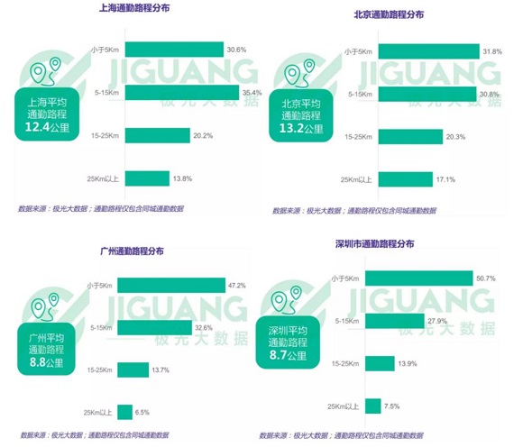 北京的两极分化情况则更为严重。高达17.1%的北京上班族通勤路程超过25公里,该比例在上海为13.8%,在深圳为7.5%,广州6.5%,在杭州(3.6%)武汉(3.1%)更是少见。