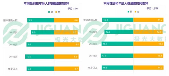 总的来说,36岁到45岁之间的中年男性最苦,其平均通勤路程和时间都是最长的。如果再碰上在北京,嗯,好好保重。