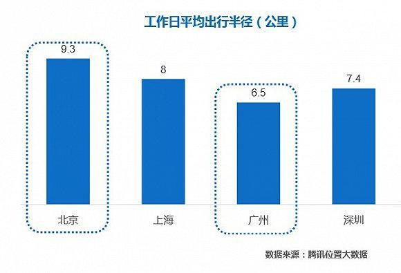 就拿2017年企鹅智酷联合腾讯位置服务发布的《城市出行半径大数据报告》来说,对比北上广深四城,北京市工作日平均出行半径(工作地址到居住地址的直线距离)为9.3公里,上班族通勤时间压力居四城之首。而广州工作日出行半径为6.5公里,相对平均出行半径最短,在四城中通勤压力最小。