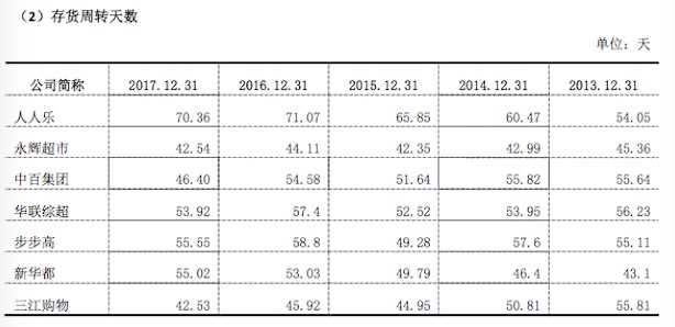 按人人乐在问询回答中给出的存货周转天数,人人乐存货周转天数自2013年以来一直比行业内可比上市公司多,它给出的主要原因,是业务结构差异:人人乐主要为超市的业态,百货业态占比很小,自营品类占比大,需要预备安全库存保证正常运营,因此整体存货周转天数较同行业可比上市公司多。