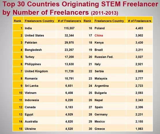上面这张表格显示出自由职业者主要包括哪些类型的人才,自由职业者及雇主所属的国家主要有哪些等等。大家可以看到,在理工科的自由职业者人数中,印度排第一,美国排第二,第三是土耳其……中国排17,从2011-2013年之间,中国的自由职业者规模是2万人。雇主最多来自于美国,从2011年到2013年,共有5万多家公司在这些平台发布项目,项目数量达18万多个。但是自由职业者从这些项目所获得的收入并不高,比如白俄罗斯平均一个项目的收入是100美元,美国是263美元。所以,大多数的自由职业者并不富有。