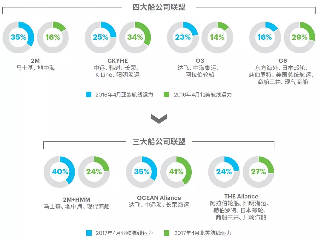 船公司超级联盟格局基本形成,三大联盟控制了亚欧99%、北美航线92%以上的运力。未来各大航运联盟将继续维持在亚欧和北美航线的份额和收益,进而增加对港口高效运营和降低成本的诉求。