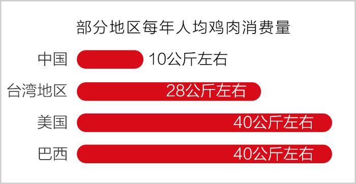 中国人均鸡肉消费量每年仅为10公斤左右,美国、巴西人均鸡肉消费量超过每年40公斤。