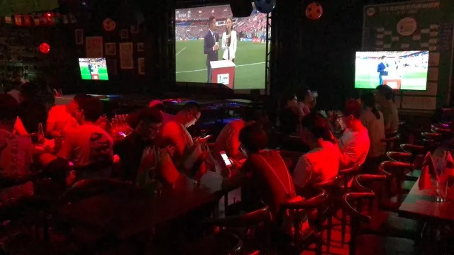 ▲昨晚10点,俄罗斯世界杯开幕式即将开始,DK LOUNGE酒吧中已聚齐了一批球迷