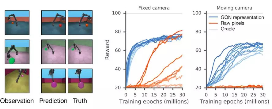 图:使用GQN,我们观察到数据效率更高的策略学习(policy learning),与使用原始像素的标准方法相比,其获得收敛级性能的交互减少了约4倍。