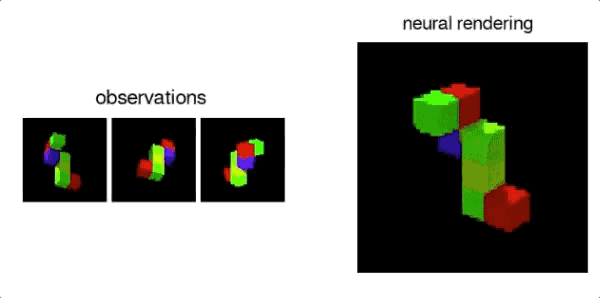 例如,表示网络会简洁地将“蓝色立方体”表示为一组数字,而生成网络将会知道如何以特定的视点将其显示为像素。