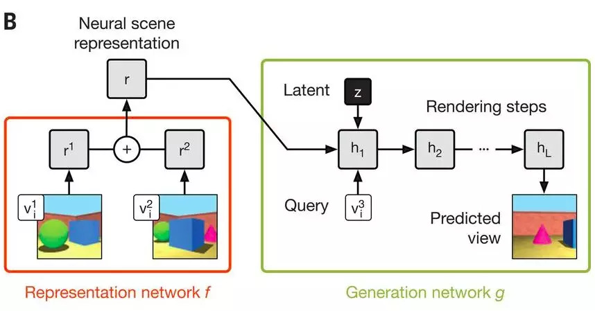 在训练过程中,生成器学习环境中的典型对象、特征、关系和规则。这种共享的“概念”集合使表示网络能够以高度压缩、抽象的方式描述场景,让生成网络在必要时填充细节。