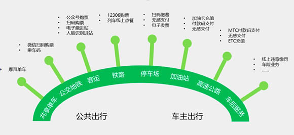 微信智慧交通解决方案目前在出行领域布局分为公共出行和车主出行两个维度,涵盖城际交通、城市内交通、加油站、停车场等多应用场景,融合微信支付、腾讯云、微信公众号、小程序、AI、LBS等腾讯生态能力。