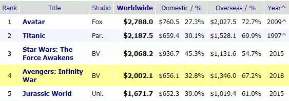 至于[侏罗纪世界]的全球票房,就更猛了。16.7亿美元的票房位列全球影史票房第5。