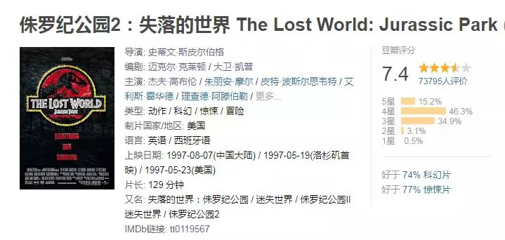 第二部1997年的[侏罗纪公园2:失落的世界],和前作一样,也是基于原著作者迈克尔·克莱顿的小说改编,这一部开始,侏罗纪系列就在国内上映。