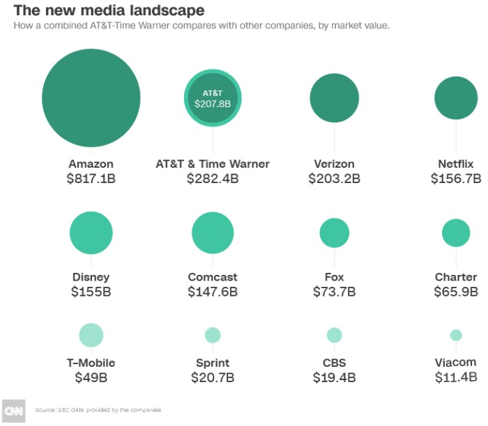 美国的传统媒体行业正在向小圈子发展,康奈尔大学法学院教授乔治·海(George A. Hay)就认为,AT&T收购时代华纳还会促成更多的媒体合并。AT&T在2016年决定收购时代华纳以后,美国的传媒行业就掀起了一阵小规模的并购狂潮。探索公司今年收购了斯克里普斯网络互动公司(Scripps Networks Interactive),这家公司掌握着Food Network和HGTV这两家媒体。维亚康姆也在考虑合并CBS,索尼影视娱乐公司和狮门影业也有可能加入战局。
