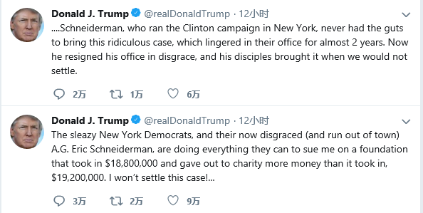 可以想象,对于在自己生日这天被提起诉讼,特朗普是如何火冒三丈。针对此事,他在6月14日当天接连发出两条推特,称安德伍德的前任施奈德曼(Eric Schneiderman)直到因为丑闻辞职前都没有胆量来搞这个案子。特朗普还说:“卑劣的民主党人,用一切能找到的理由来诬告我。我的基金会收到1880万美元,给慈善捐了1920万美元。我是绝不会庭外和解的!”