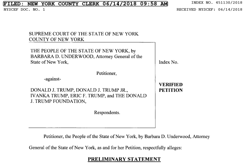民主党人、纽约州总检察长安德伍德(Barbara Underwood)在起诉书中透露,特朗普本人和特朗普基金会涉嫌长期违规偿付企业和个人债务,违反竞选资金相关法律,在给美国内税务局(IRS)上交的文件里作假,以及自我交易等。