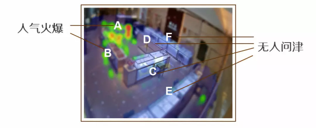 2. 从两个入口进入的人流都往A、B柜台移动,形成热力点,是该门店的明星柜台