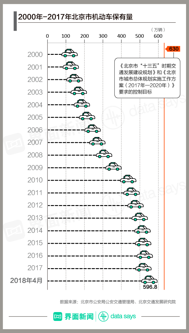根据北京市公安局公安交通管理局发布的数据,从2000年开始北京市机动车保有量不断上升,截至2018年4月,这一数字是596.8万辆。