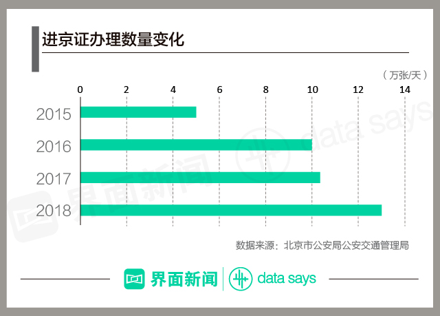 自北京限购以来,外地车牌高速增长,“进京证”的办理数量也逐年上升。目前平均每周办理“进京证”的外地号牌车辆已超过91万辆。
