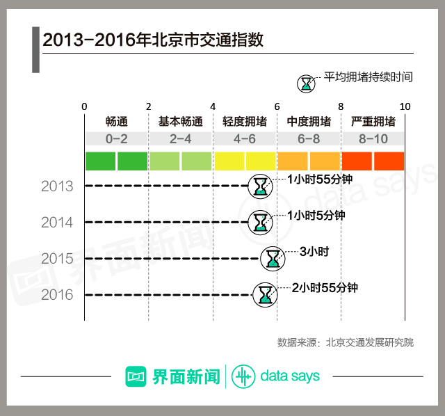 同样根据北京市交管局统计,2013年北京平均拥堵持续时间为1小时55分钟,在2016年这一时间已经变成2小时55分钟。