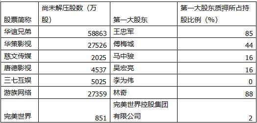 在表1中,对比主营业务类似的四家影视公司中,华谊兄弟第一大股东质押占所持股比例最高,其次是华策影视,但两者第一大股东质押比相差近一倍。当然高质押率并非华谊兄弟一家,无独有偶,手游股龙头游族网络11日发布质押股公告,披露其第一大股东林奇,截止公告日累计质押269716151股,占其持有公司股份的88.18%,位居表内第一大股东质押占所持股比例第一。