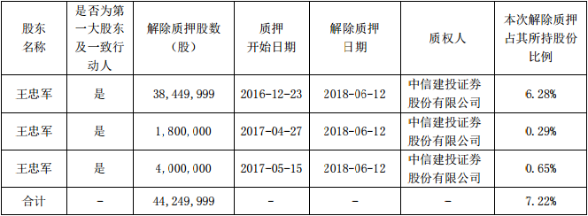 表2:6月13日华谊兄弟披露的关于股东部分股份解押表