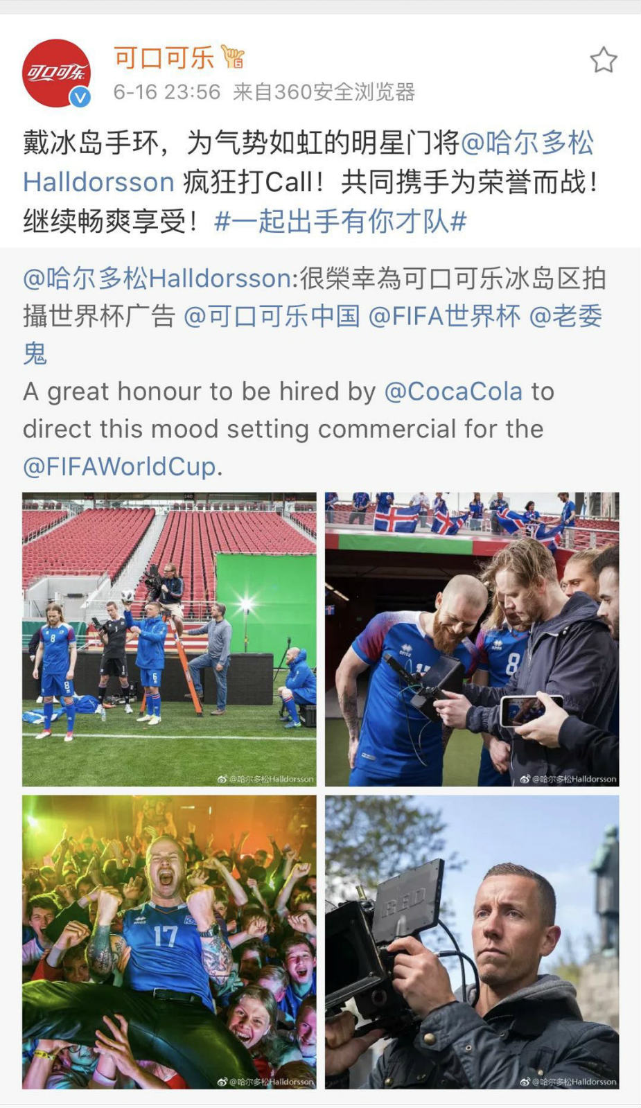 “被足球生涯耽误的广告导演”“不会拍广告的球员不是好守门员”全世界网友们都在感叹。而@哈尔多松Hallorsson 本人在新浪微博发布消息,证实了他为可口可乐拍摄了在冰岛播出的广告。可口可乐则迅速转发跟进热点。