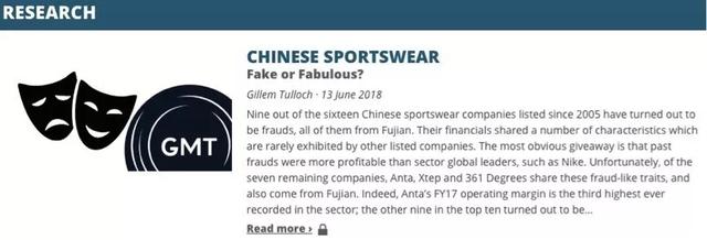 新浪财经报道,做空机构GMT在6月12日发布了一份报告,质疑国产运动品牌财务造假。做空报告称,自2005年以来,在上市的16家中国体育用品公司中,已经有9家被证实是骗子,全部来自福建,不幸的是,其他7家公司中,包括安踏(02020.HK)、特步(01368.HK)和361度(01361.HK)等,这些公司与已经被证实是骗子的公司存在诸多相同的特征。GMT建议卖出或回避这些公司。