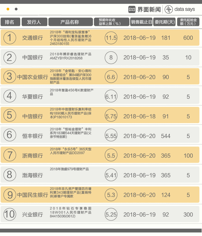来看看本周有哪些可以挑选的银行理财产品,本周,18家国有商业银行和股份制商业银行全国范围在售针对个人的人民币理财产品321只,界面新闻从每家筛选了收益率最高、最值得关注的理财产品,共10只。
