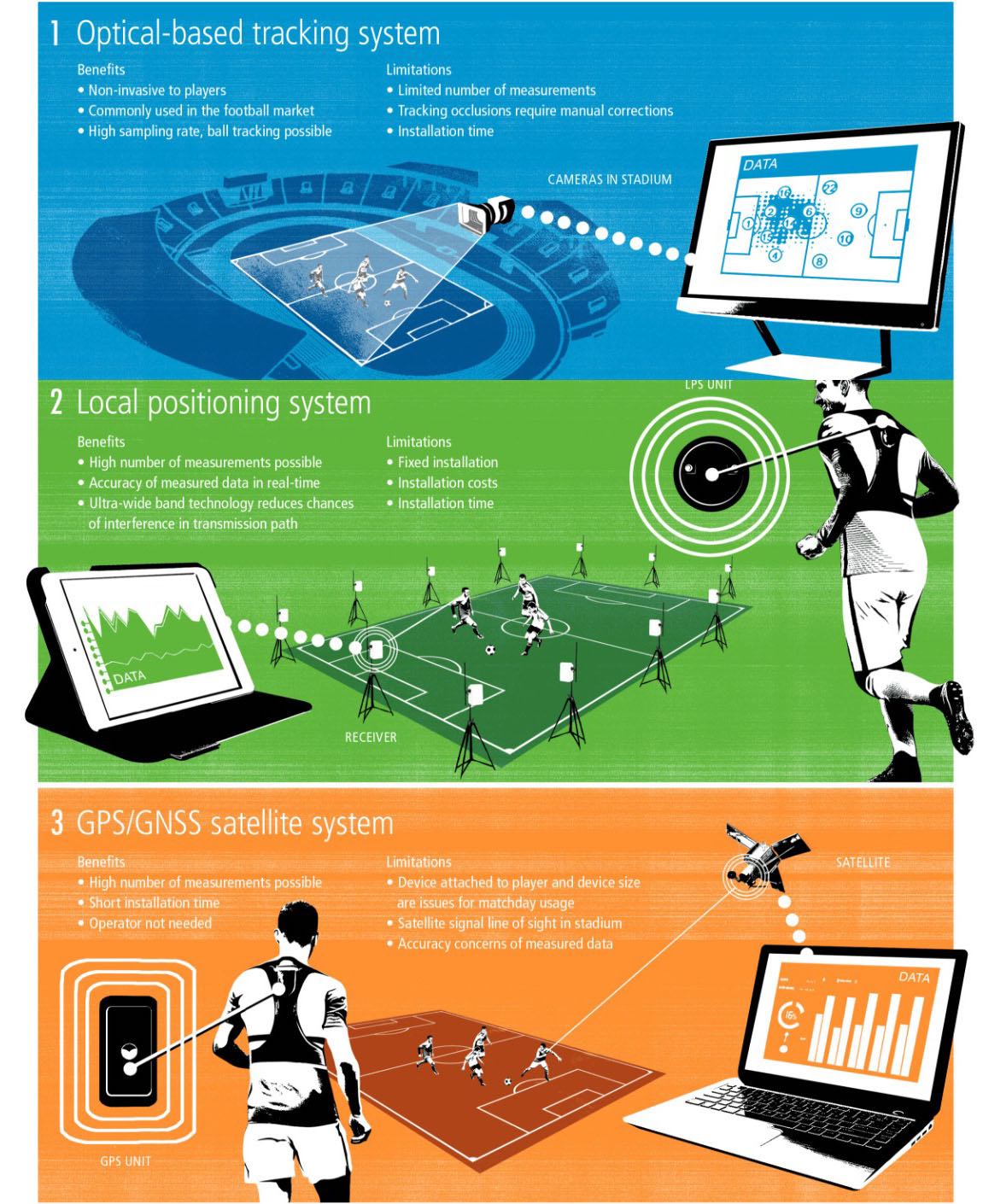 据 FIFA 官网的资料显示,「数字化表现和跟踪系统」主要是通过光学追踪系统,球员身上的 GPS / LPS 定位系统等三种方式记录数据,并为这次参赛的 32 支球队提供赛场上球员的数据,而这些信息最迟会在 30 秒内输送到主控台、板凳上的教练以及医疗团队手中的平板电脑上。