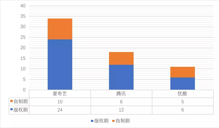 2018暑期档三大视频网站自制剧、版权剧数量。 (数据来源:影视前哨综合统计)