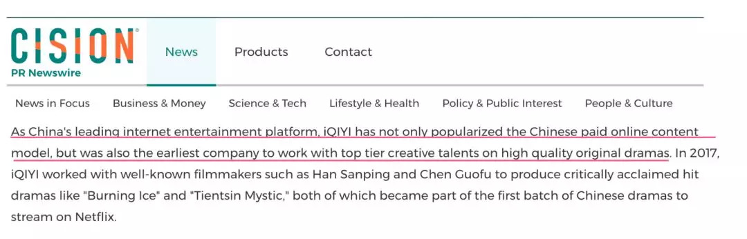 全球领先的媒体情报公司CISION认为,爱奇艺作为中国领头的娱乐视频网站,不仅引领了中国线上内容付费模型,而且也是最早同头部人才合作生产高质量原创剧集的公司。