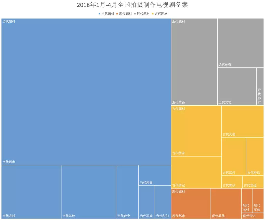 从2018年1月至4月总局全国拍摄制作电视剧备案情况可以看出,反映当代社会现实的都市剧、农村剧,展现近代革命历史的革命剧等过审占比较大,而古代题材剧过审不超过15%。
